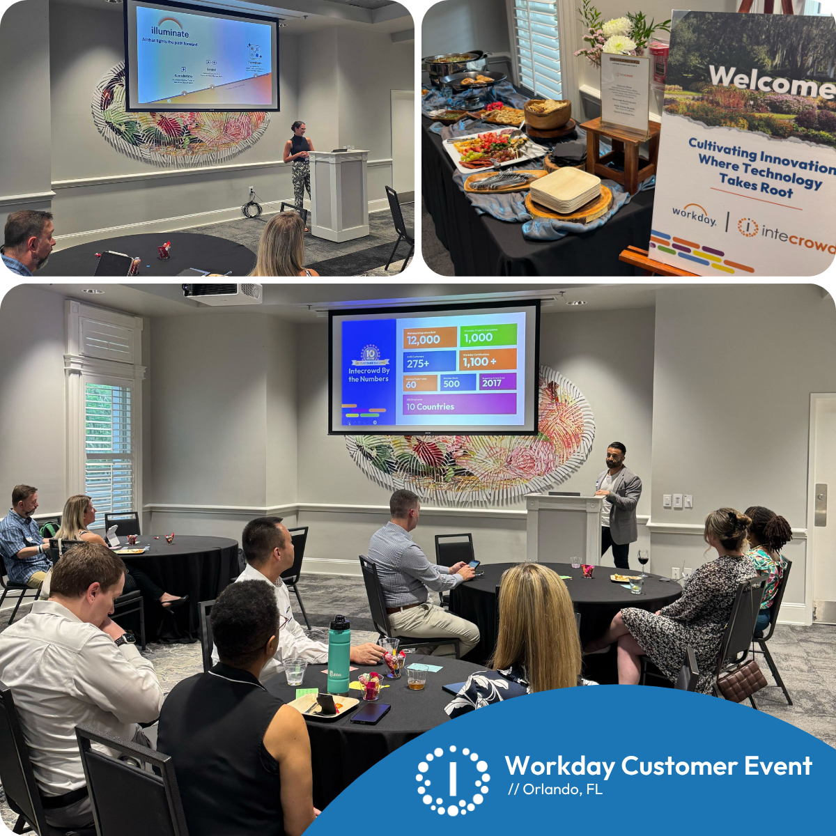 We had a great evening meeting with Orlando area Workday Customers in a co-sponsored event with Workday at the Harry P. Leu Botanical Gardens. Customers were able to explore the gardens, network over food and beverages, and share ideas together after hearing a bit from Workday and Intecrowd professionals on hot topics.